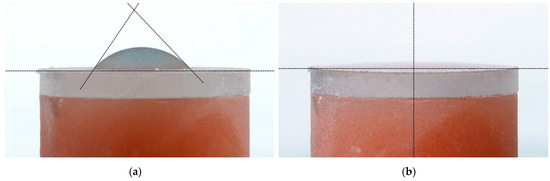 Sessile drop of water (20 μL) on PMMA surface sandblasted at 2.8 (a) Rocatec Pre only, contact angle 90°–100°; (b) Rocatec Pre and Rocatec Plus, contact angle 5° to 10°.