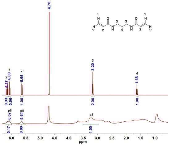 The structure of HPNPAMs was characterized by IR spectra, 1H NMR spectra and MDSEC. The results of 1H NMR spectra and MDSEC revealed the topology structure information including DB and α. Frey pointed out that DB was defined as the ratio between the number of dendritic units and the total number of units. Thus, DB can be calculated according to the integration ratio of different protons by using 1H NMR. For HPNPAMs, there are three kinds of units as shown in Figure 1. A is the dendritic unit, B is the linear unit or terminal unit. The different protons are labeled as p1, p2, p3, p4, p5 and p6. Both dendritic units and linear units or terminal units include protons of p3 and p4, therefore the total number of units can be represented by the area of p3 or p4. However, the chemical shift of p4 is overlapped with p1, thus the area of p3 is used to represent the total number of units in this paper. Assuming that there is no side reaction, the molecular chain is made up of linear units, therefore the integration ratio of p3 and p6 should be 2:1. However, the pendant vinyl groups are initiated to form branched chains, leading to the decrease in area of p6. Obviously, the decrement of the area of p6 is attributed to the dendritic units, which can be calculated by the equation (p3 − 2 × p6). Therefore, the equation for DB is written as DB = (p3 − 2 × p6)/p3. 1H NMR for sample 7 is displayed in Figure 2 (1H NMR spectras for the rest samples are shown in Figure S3). The areas of p6 and p3 are shown under the corresponding peaks. The DB of sample 7 is 0.66 according to the aforementioned equation.
