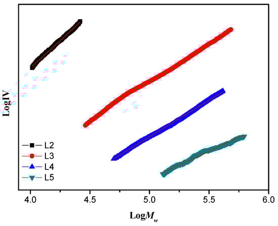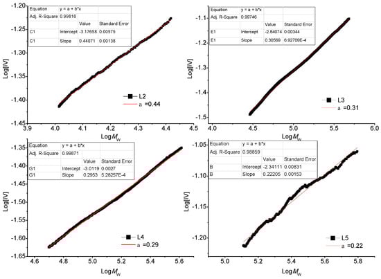 The plots of LogMw vs. Logŋ (L2 α = 0.44, L3 α = 0.31, L4 α = 0.29, L5 α = 0.22).