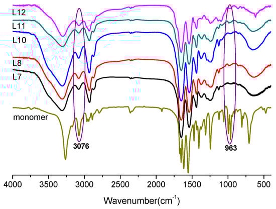IR spectra were also occupied to characterize the structure of HPNPAMs and are shown in Figure 5 and Figure S1. Based on the reaction mechanism, part of vinyl groups would disappear after polymerization. The characteristic absorption peaks of =C–H are located at 963 and 3076 cm−1 in the IR spectra. As expected, compared with monomer, the intensity of peaks located at 963 and 3076 cm−1 obviously become weak, which indicates the number of vinyl groups that took part in the polymerization. The peaks of 963 and 3076 cm−1 are assigned to pendant vinyl originating from the linear units and terminal units of HPNPAMs.