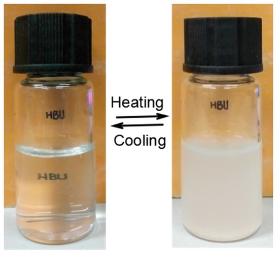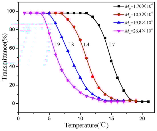 As shown in Figure 7, at a relatively low temperature, a certain concentration of the polymer solution is transparent. As the temperature increases, the solution gradually becomes cloudy, and this change process is reversible. This phenomenon indicates that the HPNPAM has a temperature sensitive performance. For the kind of poly(acrylamide)s, the phenomenon of LCST is concerned with the number of carbons or the ratios of hydrophilic and hydrophobic groups as proved by the results of Table 1. Screening out the data with the same molecular weight and different DB as standard, these data are listed in Table 5. Their LCST values are closed although there is a big gap between the DB, which indicates that DB has little influence on LCST. If DB is not the major reason for the different LCST values, molecular weights will be the key factor. As Zhou pointed out, the macromolecules with higher Mw will undergo the phase transition first [22]. LCST curves of L4, L7, L8 and L9 are shown in Figure 8. LCST increased with molecular weights, which is consistent with Zhou’s conclusion. The same trend also appears in Table 2 and Table 4.