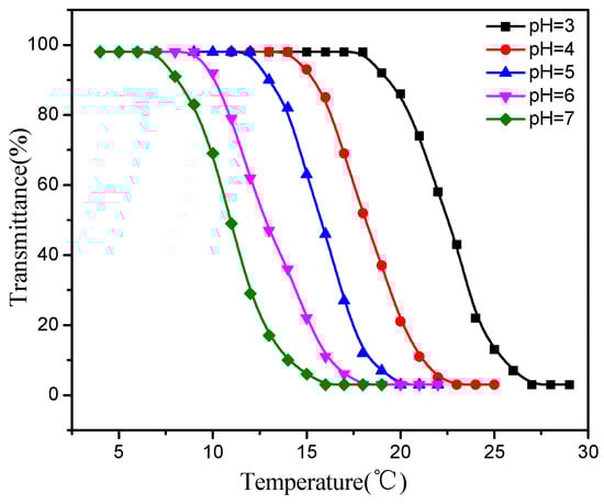 The curves of transmittance versus temperature of HPNPAMs. Aqueous solution with different pH values. Solution concentration: 3 mg·mL−1; heating rate: 0.1 °C·min−1.