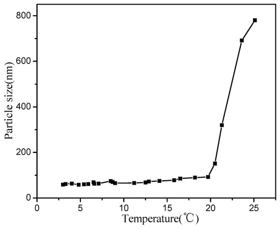 The diameter of nanomicell vs. Temperature for each temperature, measuring the diameter after holding the temperature for 10 min. Solution concentration: 2 mg·mL−1; heating rate: 0.1 aqueous·min−1; pH = 4.