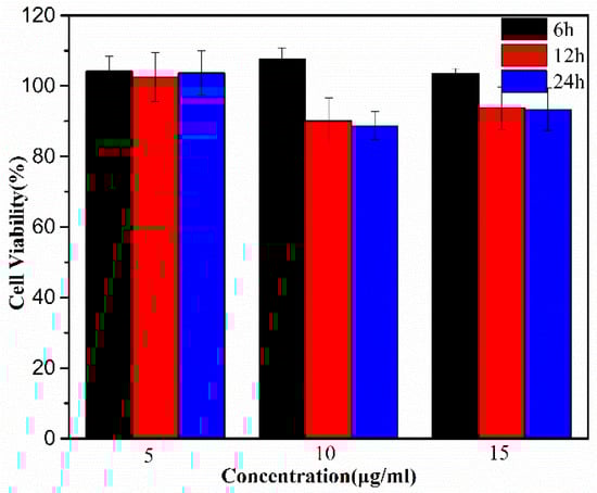 In the biomedical field, cell viability is often used to determine the cytotoxicity and biocompatibility for materials. The cytotoxicity against Hela cells was studied by using the MTT assay. The resulting HPNPAM is homopolymer, the composition of every sample is the same, only with different Mw and DB, so it is reasonable that only a sample for the cytotoxicity assays represents all the samples. Figure 12 shows the cell viability after incubation with L12 at various concentrations. The cell viability was around 100% for all of the concentrations after 6 h incubation with L12. The cell viability could reach 80% even when the cells were incubated for 24 h with concentration of 15 μg·mL−1. The cytotoxicity test results showed that the toxicity of HPNPAM in a short period of time was very low. As everyone knows, the half-life of the drug determines its carrier’s residence time in the cell, and the half-life of the drug is usually less than 24 h; after 24 h, the carrier material may also be discharged through metabolism. Therefore, the HPNPAM’s low cytotoxicity has initially led to its potential applications for drug delivery systems.