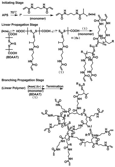 Taking the HPNPAM as an example, the reaction mechanism of HPNPAM is outlined in Scheme 1. In the initiating stage, the initiator APS is decomposed to initial free radical under 70 °C, then the monomers are initiated by the initial free radicals that are consistent with the established mechanism of RAFT polymerization [21]. In the branching propagation stage, the vinyl groups as the side groups possess reaction activity and can be initiated by the active species (I•, R•, and I-m•). Therefore, the branched structure or degree of branching (DB) will be increased with the conversion of the vinyl groups. For the multi vinyl monomer, it will be polymerized, forming a crosslinked polymer rather than a hyperbranched polymer due to the high reactivity of vinyl groups. Thus, RAFT has to be occupied for slowing down the growth rate and avoiding rapid cross-linking. Finally, the HPNPAMs are obtained bearing amount of vinyl groups and thioester.