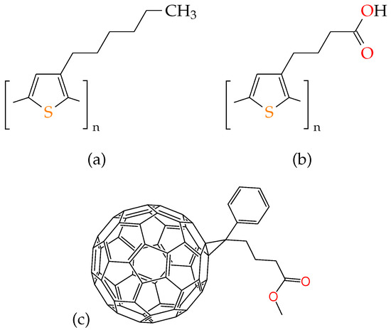 Schematic chemical structures of polymeric materials P3HT (a), P3BT (b) and PCBM (c). For better contrast, sulphur sites are marked orange, and oxygen sites are marked red.