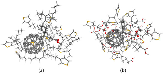 A visualization of DFT-optimized structures of clusters: (a) PCBM molecule surrounded by 16 P3HT monomers (520 interaction sites in total); (b) PCBM molecule surrounded by 10 P3BT monomers (508 interaction sites in total). Optimization has been performed with the use of the PBC functional [42] with OBS vdW correction [43] and the DND basis set.