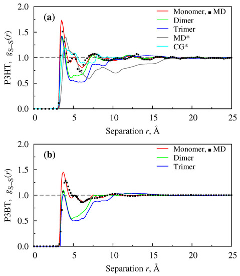 Radial Distribution Functions (RDFs) for S–S interaction sites belonging to neat films P3HT (a) and P3BT (b), modelled as monomers, dimers or trimers at 400 K. MD data are taken from [70] and CG from [24].