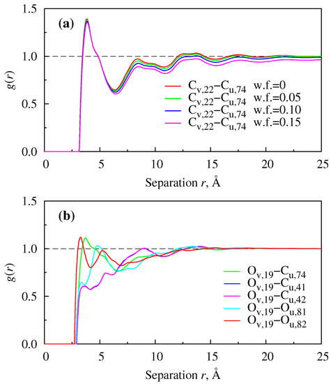 Parameters of the Lennard–Jones potential for interaction sites in the all-atom models of P3HT, P3BT and PCBM for RISM calculations were taken from the UFF [44,45,46]. Their actual numerical values together with interaction site Coulomb charges and Cartesian coordinates can be found in the SM. The calculations were performed for pure neat films of P3HT and P3BT monomers, dimers and trimers and blends of PCBM in P3HT and PCBM in P3BT monomers at various weight fractions (w.f.), starting from infinite dilution and up to 15% of PCBM, and at temperatures of 400, 450, 500, 550 and 600 K. Densities were adopted from two different sources: 0.933 [47] and 1.15 g/cm [48], for both P3HT and P3BT, and 1.3 g/cm for PCBM. In RISM equations, the dielectric properties of components are not considered; therefore, different dielectric constants of blend components do not affect the result. In the numerical aspect, the RISM equations were discretized on a uniform radial grid of 4096 nodes with 0.05-Å resolution and converged to a relative root-mean-square accuracy of by using the Modified Direct Inversion in Iterated Space (MDIIS) accelerated numerical solver [35]. Similar set-ups for RISM or its modifications were successfully applied in our previous studies of both liquid and polymeric systems to describe their structure, explain the behaviour or to predict concentration- and thermodynamic-dependent properties [49,50,51,52,53,54,55,56,57].