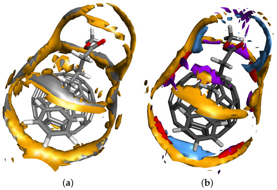 RDFs obtained in the RISM integral equation theory of fluid are averaged over orientations in space. For the general analysis of the short-range fluid structure, this may be sufficient. However, for molecules with complex geometries, as in our case, 3D distributions obtained from the 3D-RISM theory of solvation can provide additional morphological information about the solvent around the solute, including the preferential mutual orientation of molecules in space. In this respect, we run 3D-RISM-KH calculations for the studied systems at K. Figure 5a,b exhibits the isosurfaces of the 3D distribution functions of selected interactions sites from P3HT and P3BT monomers, respectively, showing the regions with the highest probability of finding the sites around the PCBM molecule. The numerical values of isosurfaces are 3.6 for both sulphur and tail end carbon sites of the P3HT molecule, while for the P3BT molecule, these values are three for sulphur, 2.6 for both oxygen sites and 2.2 for hydrogen in the OH group. It is seen well that in both cases all of the clouds appear mostly in the area between the buckyball part and the butyric acid methyl ester functional group part to form a sort of a belt with a few bridges over the functional group, but not in the opposite direction. By decreasing the isosurface numerical value, one can visualize the formation of the 3D solvation shell of the selected interaction site around the solute molecule. For our two different solvents, this process results in the following. In the case of P3HT, both sulphur and carbon clouds first extend around the functional group and then around the buckyball part of PCBM, to quickly form a solvation shell around the whole molecule. In the case of P3BT, to achieve a similar effect with the cloud for sulphur, the isosurface value should be lowered to a proportionally smaller value. The isosurfaces for oxygen and hydrogen in the OH group prefer to extend around the functional group, while for the other oxygen, the isosurface develops almost exclusively around the neck between the buckyball and functional group parts. The probability of the formation of the solvation shell around the whole solute molecule is expected to be somewhat low. It is clear then that the oxygen and the OH group of P3BT avoid close contact with the hydrophobic fragment of the PCBM molecule. This factor explains the lack of solutions to 1D-RISM equations at finite concentrations and suggests that the miscibility of the components will be low. Another observation from both 1D- and 3D-RISM studies is that the OH group may not form stable hydrogen bonds with PCBM oxygen sites simply because the formation does not occur at such high temperatures.