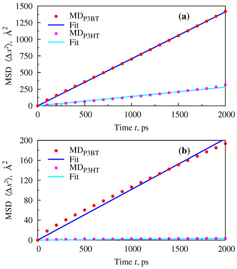 MD results for mean square displacement of PCBM in its blend with P3BT or P3HT monomers at infinite dilution and K. (a) g/cm; (b) g/cm. Symbols denote the Mean Square Displacement (MSD) values sampled from data every 200 time steps, and lines are least-squares Marquardt–Levenberg algorithm [71] linear fits to them.