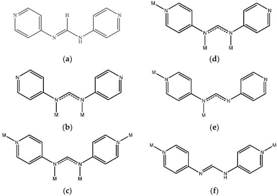 The coordination chemistry of metal complexes containing neutral formamidine and anionic formamidinate ligands has been investigated extensively in recent years [10]. Mononuclear and polynuclear complexes have been reported [10,11,12,13]. These types of ligands could be improved by having different directions of donor sites to construct coordination polymers with higher dimensionality [14,15]. In this regard, we have designed and synthesized the dimolybdenum paddlewheel complex [Mo2(4-pyf)4][4-Hpyf = N,N’-bis(pyridine-4-yl)formamidine] (Figure 1a), which was reacted with Hg(II) salts to afford the first 2D and 3D heteronuclear coordination networks based on quadruple-bonded dimolybdenum units [14]. By one-pot solvothermal reactions of 4-aminopyridine and triethylorthoformate with divalent copper salts, several 2D coordination networks of the types anti-{[Cu(4-pyf)]·solvent}n and syn-{[Cu4(4-pyf)4]·2solvent}n (solvent = MeOH and EtOH) that show crystal-to-crystal transformations and photoluminescence changes have also been reported [15]. In these complexes, the anionic 4-pyf- ligands show bidentate binding mode through two inner amine nitrogen atoms, Figure 1b, tetradentate binding mode through all the four nitrogen atoms, Figure 1c, or tridentate binding mode with one dangling pyridyl nitrogen atom, Figure 1d.