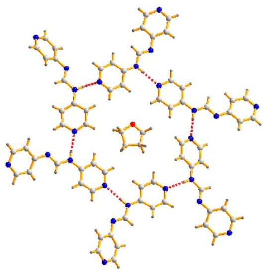 The asymmetric unit of 4-Hpyf·0.16THF contains six 4-Hpyf molecules and one THF molecule. Figure 2 depicts a packing diagram showing that the six 4-Hpyf molecules are interlinked through N–H···N hydrogen bonds [H···N = 2.019–2.075 Å, ∠N–H···N = 168.4–179.2°] to form a ring, with the THF molecule occupying the center. It is noted that the structure of 4-Hpyf without co-crystallization of solvent has been reported, in which the 4-Hpyf molecules are linked by the similar N–H···N hydrogen bonds that results in a 1D linear chain [20]. The difference in the supramolecular structures indicates the structure-directing role of the THF solvent molecule.