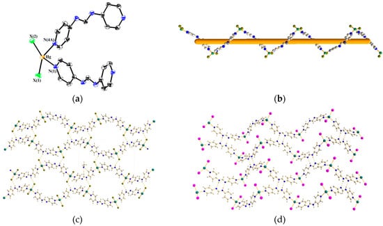 (a) A representative coordination environment about the Hg(II) ion for 2 (X = Br) and 3 (X = I); Thermal ellipsoids are shown at 30% probability level; (b) A representative drawing showing the 1D helical chain for 2 and 3; (c) A packing diagram for 2; (d) A packing diagram for 3.