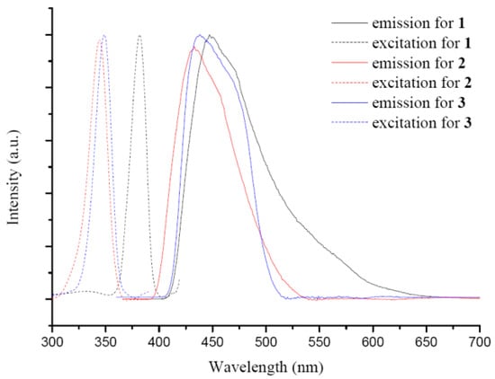 Luminescent metal complexes are able to enhance, shift, and quench the luminescent emission of organic ligands through metal coordination. The emission and excitation spectra of 1–3 were measured in the solid-state at room temperature, Figure 5. The emission spectrum of 1 exhibits a broad band at 448 nm upon excitation at 381 nm, and those of 2 and 3 show emissions at 432 and 445 nm upon excitation at 344 and 348 nm, respectively. The difference in the emission wavelengths between 2 and 3 can be ascribed to the different electronegativity of the halide anions.
