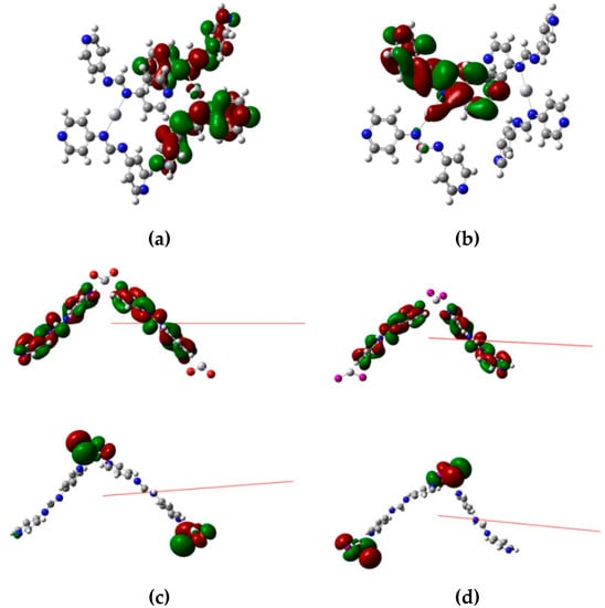 Drawings showing the electron contribution of (a) the highest occupied molecular orbital (HOMO) of 1, (b) the lowest unoccupied molecular orbital (LUMO) of 1, (c) HOMO (bottom) and LUMO (top) of 2, and (d) HOMO (bottom) and LUMO (top) of 3.