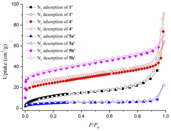 The N2 adsorption isotherms for 1’, 4’, 5a’, and 5b’.