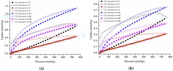 The CO2 adsorption isotherms for 1’, 4’, 5a’, and 5b’ at (a) 273 and (b) 298 K.
