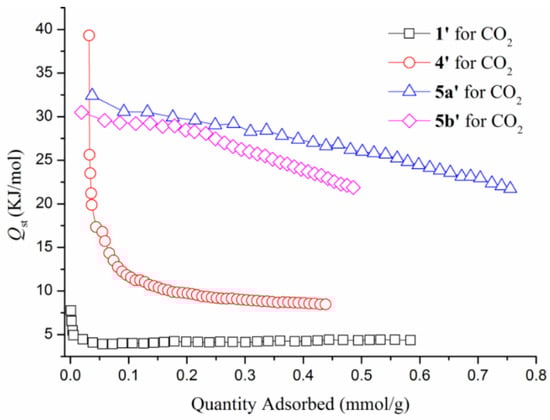 Isosteric heat of adsorption of 1’, 4’, 5a’, and 5b’ at different CO2 uptakes.