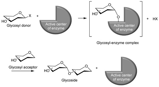 An alternative to chemical glycosylations that has also been developed involves an in vitro approach, the so-called “enzymatic glycosylation”, which offers advantages because enzymatic reactions are superior to chemical catalysis in terms of stereo- and regio-selectivities [8,9]. Of the six main classes of enzymes, transferase (glycosyl transferase) and hydrolase (glycosyl hydrolase) have been used successfully as catalysts in enzymatic glycosylations [10,11]. In these reactions, a glycosyl donor and a glycosyl acceptor are employed in their unprotected forms, whereby the reaction progresses in a stereo- and regio-controlled fashion by enzymatic catalysis in aqueous media [9]. In the same fashion as the aforementioned chemical glycosylation, the enzymatic formation of a glycosidic linkage occurs between the anomeric position of one monosaccharide residue, the activated glycosyl donor, and the hydroxy group of the second monosaccharide residue, the glycosyl acceptor (Figure 2). In the course of the reaction, the anomeric position of the glycosyl donor is initially recognized by and interacts with the catalytic center of the enzyme to form a glycosyl–enzyme complex. Next, the hydroxy group of the glycosyl acceptor attacks the anomeric carbon of the complex in a stereo- and regio-selective manner, according to the specificity of the enzyme, which gives rise to the direct formation of the unprotected glycoside. As mentioned previously, the enzymes that have been employed to catalyze these glycosylations are primarily glycosyl transferase and glycosyl hydrolase. Additionally, the former can be sub-classified into the synthetic enzymes (Leloir glycosyl transferase) phosphorolytic enzyme (phosphorylase), and sucrase [12,13].
