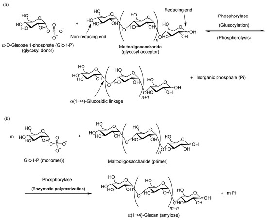 When an excess molar ratio of Glc-1-P with respect to the maltooligosaccharide acceptor is present in the reaction system, the successive glucosylations in the presence of phosphorylase occur as a propagation of polymerization to yield the α(1→4)-glucan polymer, i.e., amylose (Figure 3b) [20,24,25,26]. The reaction of such phosphorylase-catalyzed successive glucosylations is a chain-growth polymerization, and the glycosyl acceptor is often referred to as the “primer” of the polymerization because the reaction is initiated at the non-reducing end of the acceptor. Since the phosphorylase-catalyzed polymerization is conceived analogously to a living polymerization, the molecular weight of the generated amylose can be controlled by the monomer (Glc-1-P)/primer feed ratios, and the distribution of polymeric products is typically narrow (Mw/Mn < 1.2) [27].