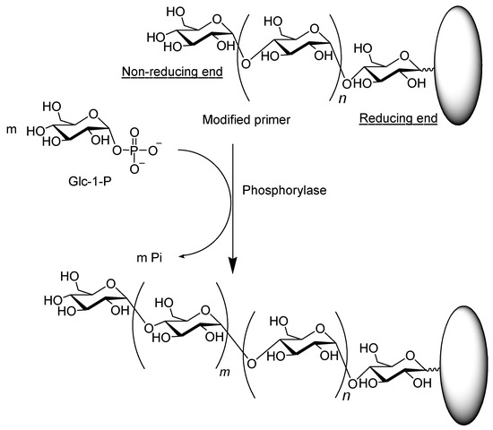 The phosphorylase-catalyzed enzymatic polymerization can be conducted using modified maltooligosaccharide primers, which are covalently immobilized on other substances at its reducing ends, such as a polymeric chain, which does not take part in the polymerization (Figure 4) [28,29,30,31,32,33,34]. Such a modified primer is typically multifunctional because of the presence of multiple non-reducing maltooligosaccharide chain ends on the substance, and has produced various amylose-grafted polymeric materials, such as amylose-grafted polystyrene, polyacetylene, poly(dimethylsiloxane), poly(vinyl alcohol), and poly(l-glutamic acid) [35,36,37,38,39,40,41]. Amylose-grafted brushes were also obtained by the phosphorylase-catalyzed enzymatic polymerization of Glc-1-P from maltoheptaose primers covalently attached to Au and Si surfaces [42].