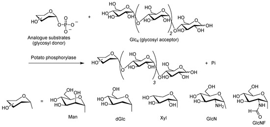 Phosphorylase has demonstrated loose specificity for the recognition of the substrate structures of interest, and therefore, the extension of phosphorylase-catalyzed enzymatic glucosylations using several monosaccharide 1-phosphates, i.e., analog substrates of Glc-1-P, as glycosyl donors to obtain non-natural oligosaccharides comprising the corresponding monosaccharide residues at the non-reducing ends has been investigated [43,44]. For example, potato phosphorylase has shown recognition for α-d-mannose, 2-deoxy-α-d-glucose, α-d-xylose, α-d-glucosamine, and N-formyl-α-d-glucosamine 1-phosphates (Man-1-P, dGlc-1-P, Xyl-1-P, GlcN-1-P, and GlcNF-1-P, respectively) as glycosyl donors in glycosylations using Glc4 as a glycosyl acceptor, to produce non-natural α-mannosylated, 2-deoxy-α-glucosylated, α-xylosylated, α-glucosaminylated, and N-formyl-α-glucosaminylated pentasaccharides, respectively (Figure 5) [45,46,47,48,49,50].