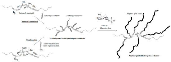 On the basis of the above viewpoint, the phosphorylase-catalyzed enzymatic polymerization of Glc-1-P has been employed for the synthesis of amylose-grafted functional heteropolysaccharide materials by chemoenzymatic approaches (Figure 6) [29,30,31,32,33,34]. One such synthesis was achieved using the aforementioned modified primer, where the reducing ends of maltooligosaccharides were covalently connected to polysaccharide chains, such that, in this case, appropriate chemical reactions were carried out to immobilize maltooligosaccharides onto the main-chain polysaccharides, and the resulting modified primers were then used for the phosphorylase-catalyzed enzymatic polymerization. Two types of chemical reactions have been employed to prepare the modified primers: the reductive amination using reductants of maltooligosaccharides with basic polysaccharides containing amino groups, and the condensation using condensing agents of amine-functionalized maltooligosaccharides with acidic polysaccharides containing carboxylate groups.
