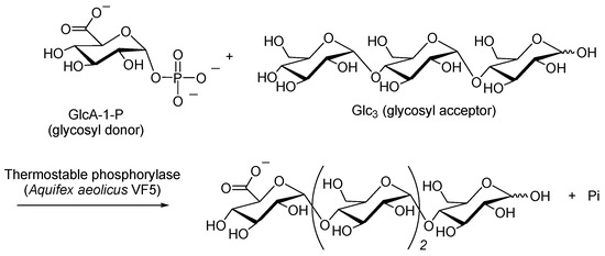 In addition to the introduction of GlcN units containing an amine functional group to maltooligosaccharides by phosphorylase-catalyzed glycosylation (glucosaminylation) using GlcN-1-P as a glycosyl donor [49], an attempt has also been made to enzymatically produce a different functional oligosaccharide by phosphorylase catalysis using the analog substrate, α-d-glucuronic acid 1-phosphate (GlcA-1-P), in which a carboxylate group can be introduced to the maltooligosaccharide. Potato phosphorylase did not recognize GlcA-1-P, however, and thus the desired functional oligosaccharide was not produced by catalysis with this particular enzyme. Interestingly, it was found that thermostable phosphorylase isolated from Aquifex aeolicus VF5 [68] did recognize GlcA-1-P and could catalyze the glycosylation (glucuronylation) of Glc3, the smallest glycosyl acceptor recognized by this enzyme, to produce an acidic tetrasaccharide containing a carboxylate group (Figure 8) [69].
