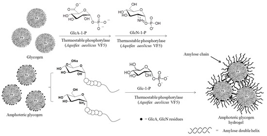 - Takata, Y.; Yamamoto, K.; Kadokawa, J. Preparation of pH-responsive amphoteric glycogen hydrogels by α-glucan phosphorylase-catalyzed successive enzymatic reactions. Macromol. Chem. Phys. 2015, 216, 1415–1420. [Google Scholar] [CrossRef]