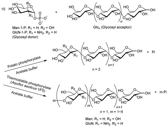 A series of studies on the potato phosphorylase-catalyzed glycosylations using analog substrates have suggested that if a single monosaccharide residue is transferred from the analog substrates to the non-reducing end of the maltooligosaccharide acceptor, further glycosylations will not occur because the new structure different from the Glc residue at the non-reducing end is no longer recognized by the enzyme (Figure 10) [43,44]. When the thermostable phosphorylase (from Aquifex aeolicus VF5) was instead employed, reactions of Glc3 using excess molar ratios of Man-1-P and GlcN-1-P, successive mannosylations/glucosaminylations took place to obtain non-natural heterooligosaccharides composed of α(1→4)-linked mannose/glucosamine chains (Figure 10) [73]. The MALDI-TOF mass spectra of the products of this thermostable phosphorylase-catalyzed enzymatic glycosylation with a donor to acceptor feed ratio of 10:1 showed several peaks corresponding to the molecular masses of tetra-octa-saccharides having one–five Man or GlcN residues with Glc3. Further chain-elongation for higher DPs, however, was inhibited by Pi produced from the glycosyl donors, which is a naturally occurring substrate for phosphorolysis by phosphorylase catalysis.