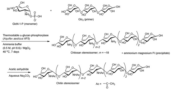 An attempt was made to remove this Pi as a precipitate in the thermostable phosphorylase-catalyzed glucosaminylation by conducting the reaction in an ammonium buffer (0.5 M, pH 8.6) containing MgCl2, as it has been reported that Pi forms an insoluble salt with ammonium and magnesium ions [74]. Consequently, the thermostable phosphorylase-catalyzed polymerization in the buffer system at 40 °C for 7 days of GlcN-1-P with the Glc3 primer (30:1) successfully occurred to produce the α(1→4)-linked glucosamine polymer with a DP of the GlcN units of ~20 (Mn = 3760 ), which corresponded to the structure of a chitosan stereoisomer, a non-natural aminopolysaccharide (Figure 11) [75]. This product was then converted into a chitin stereoisomer, also a non-natural aminopolysaccharide, by N-acetylation using acetic anhydride (Figure 11). The enzymatic copolymerization of Glc-1-P with GlcN-1-P using thermostable phosphorylase catalysis was also performed under the same conditions to obtain a non-natural heteroaminopolysaccharide composed of Glc/GlcN units [76].
