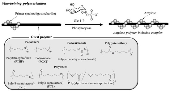 It has been reported that phosphorylase-catalyzed enzymatic polymerization to form the shorter α(1→4)-glucan (maltooligosaccharide) to the longer α(1→4)-glucan (amylose) induces inclusion complexation with hydrophobic guest polymers [15,16,34,88,89,90,91,92,93]. Such an efficient method for the formation of amylose-polymer inclusion complexes was achieved by the phosphorylase-catalyzed enzymatic polymerization of amylose in a dispersion of hydrophobic polymers in aqueous buffer solvents. The process of this synthetic method for the generation of such inclusion complexes is similar to the way that vines of plants grow and twine around a rod (Figure 12), which is why this polymerization approach has been named “vine-twining polymerization”. Hydrophobic polyethers, such as poly(tetrahydrofuran) (PTHF), poly(oxetane) (POXT)) [94,95]; polyesters, such as, poly(δ-valerolactone) (PVL), poly(ε-caprolactone) (PCL), poly(glycolic acid-co-ε-caprolactone)) [96,97,98]; polycarbonates, such as, poly(tetramethylene carbonate) [99]; and poly(ester-ether)s (–CH2CH2C(C=O)OCH2CH2CH2CH2–) [97] have been observed to act as guest polymers and have been included into amylose using this polymerization technique (Figure 12). Vine-twining polymerization does not produce inclusion complexes with hydrophilic polymers, such as PEG and the other poly(ester–ether)s, owing to insufficient interactions between the polymer and the cavity of the amylose. In addition, the inclusion via vine-twining polymerization has not been achieved with strongly hydrophobic polymers like poly(oxepane), due to their aggregation in aqueous buffer solvents as a result of their longer alkyl chains when compared to PTHF and POXT. It can therefore be concluded that the moderate hydrophobicity of guest polymers is the important factor in determining whether or not amylose will form inclusion complexes during a vine-twining polymerization.