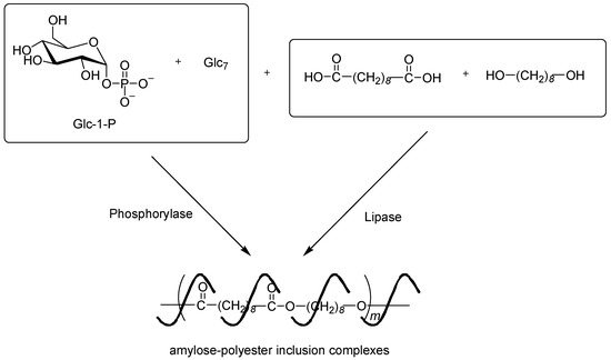 An attempt at a parallel enzymatic polymerization system was made to achieve the formation of an inclusion complex with a strongly hydrophobic polyester [100]. In this system, two enzymatic polymerizations, the phosphorylase-catalyzed enzymatic polymerization of Glc-1-P from the Glc7 primer to produce amylose, and the lipase-catalyzed polycondensation of a diol (1,8-octanediol) and a dicarboxylic acid (sebabic acid) to produce a strongly hydrophobic aliphatic polyester as the guest polymer [101,102], were simultaneously conducted in an aqueous buffer solvent (Figure 13). Success was achieved using this approach, and consequently, the analytical results of the reaction fully supported the formation of an inclusion complex between amylose and the polyester.