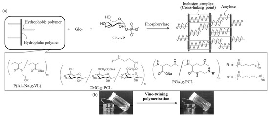 Amylose supramolecular network hydrogels were fabricated through the formation of vine-twined inclusion complexes of amylose during the phosphorylase-catalyzed polymerization. In these studies, the designed graft copolymers, such as poly(acrylic acid sodium salt-graft-δ-valerolactone) (PAA-Na-g-PVL), CMC-graft-PCL (CMC-g-PCL), and poly(γ-glutamic acid-graft-ε-caprolactone) (PGA-g-PCL) were employed as guest polymers (Figure 14a) [107,108,109], while the hydrophilic main-chains, PAA, CMC, and PGA, acted as the main components of the hydrogels. When the vine-twining polymerization was carried out in the presence of these guest graft copolymers in aqueous acetate buffer solution, the reaction mixtures yielded the supramolecular network hydrogels through inclusion of the graft chains with amylose to form supramolecular copolymers (Figure 14b). The intermolecular inclusion complexes could act as cross-linking points to construct higher-order supramolecular network structures in the hydrogels.