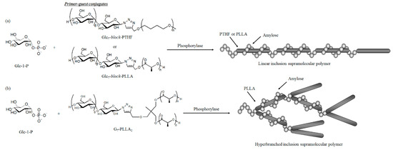 Supramolecular polymers comprised of amylose-PTHF and amylose-PLLA inclusion complexes were successfully fabricated by vine-twining polymerizations using Glc7-block-PTHF and Glc7-block-PLLA, respectively, as primer–guest conjugates (Figure 15a) [110,111]. In these systems, a propagating amylose chain initiated by phosphorylase catalysis from a Glc7 conjugate could potentially include a guest polymer segment from another conjugate, whereby the successive occurrence of such an event would give rise to linear inclusion supramolecular polymers.