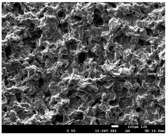 Polyurethane/urea copolymers (PUR) based on poly(ethylene glycol) (PEG), hereafter PURPEG, with the chemical structure presented in Figure 1, were prepared as a foam using a standard emulsification and freeze-drying procedure. The preparation procedure of the PURPEG polymer is explained in more detail in our recently published study [33]. As shown in the image in Figure 2, which was recorded by scanning electron microscopy (SEM), the samples were highly porous. The porosity was approximately 70% with a surface and interior pore size of 30–90 and 70–130 μm, respectively.