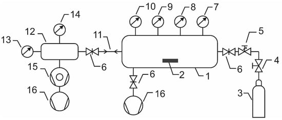 Schematic of the experimental setup: 1—plasma reactor, 2—sample, 3—oxygen flask, 4—high pressure valve, 5—leak valve, 6—gate valves, 7—double electrical probe, 8—optical spectrometer, 9—catalytic probe, 10—absolute vacuum gauge, 11—capillary, 12—high vacuum chamber, 13—high vacuum gauge, 14—residual gas analyzer, 15—turbomolecular pump, 16—rotary pumps.