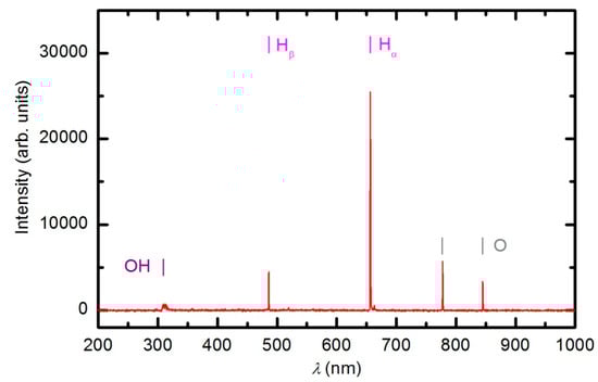OES spectrum after 600 s of plasma treatment at 33 Pa and forward power of 150 W.