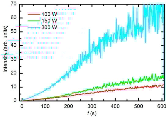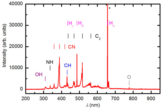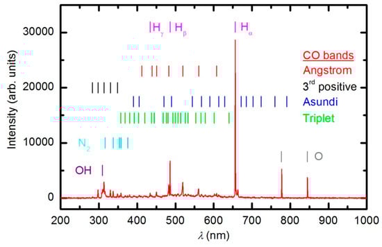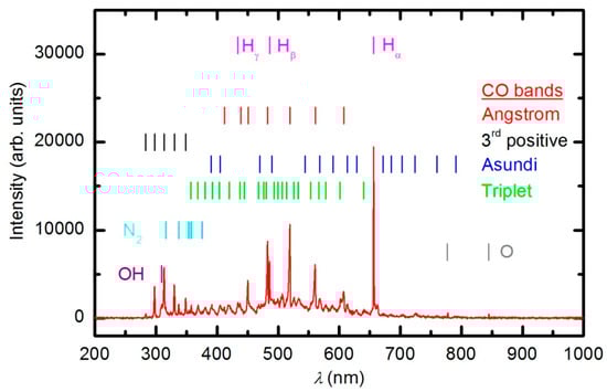 As the plasma treatment continued, some new spectral features emerged. Figure 6 reveals the spectrum after 30 s of plasma treatment at a forward power of 150 W. Between 300 and 400 nm, a barely visible N2 second positive band (C3Πu–B3Πg) indicates that the sample also contains nitrogen. All other subsequent spectral features are attributed to CO radicals, which can be explained by etching of the sample [35,36]. In the UV region of the spectra, there is a 3rd positive band, which belongs to the transitions between b3Σ+ and a3Π states. The central part of the spectrum from 350 to 800 nm is dominated by a broad continuum, which is known to be composed of overlapped bands of three CO systems: Angstrom (B1Σ+–A1Π), Triplet (d3Δ–a3Π) and Asundi (a’3Σ+–a3Π) bands [37,38]. The intensity of the CO bands in Figure 6 is a rather weak, qualitative indication that the amount of reaction products (CO2 and CO) is small in the initial stage of polymer processing.