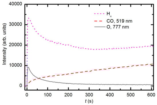 Time evolution of the CO emission peak (519.5 nm), O (777.4 nm) line and Balmer Hα line during sample etching with oxygen plasma generated at a pressure of 33 Pa and 150 W forward RF power.