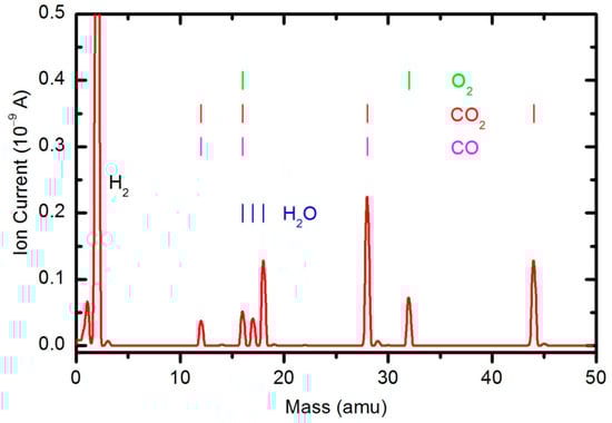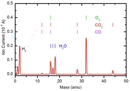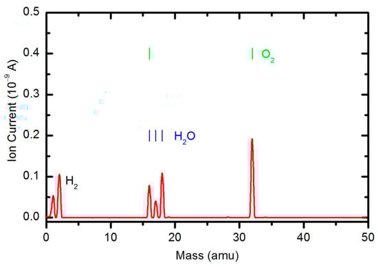 The results of the OES measurements as summarized in Figure 8 and Figure 9 do not reveal the absolute concentration of stable gaseous molecules in the plasma chamber during polymer sample treatment. To quantify the results, we also performed measurements by mass spectrometry. Figure 10 shows a mass spectrum that was measured in an empty chamber filled with oxygen at a pressure of 33 Pa, and the spectra shown in Figure 11 and Figure 12 were obtained in a chamber containing samples after 30 and 600 s of plasma treatment, respectively. The forward RF power was 150 W.