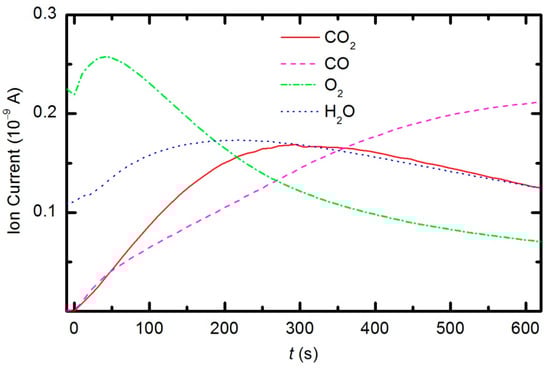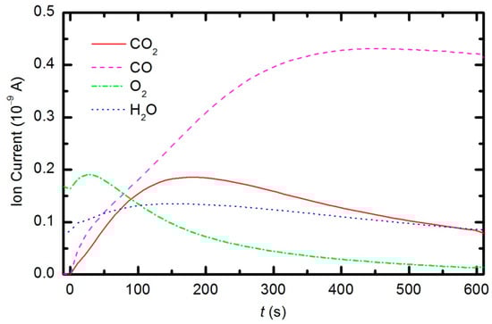Peaks attributed to H2, H2O, O2, CO2 and CO can be observed in the mass spectra. The RGA spectrum recorded in an empty chamber contains only H2, H2O and O2 peaks. Because of the cracking pattern of the RGA, molecules are not detected as only one mass peak. All of the detected peaks for a certain molecule are marked in Figure 10, Figure 11 and Figure 12. For example, the peak at mass 16 is the sum of the contributions from the following stable molecules: H2O, O2, CO2 and CO. Fortunately, the molecules H2O, O2 and CO2 can be monitored by directly observing masses 18, 32 and 44, respectively. To observe CO molecules, which are produced during the plasma treatment of a sample, one must subtract 11.4% of the mass 44 peak intensity from mass 28. Thus, it is possible to quantify the evolution of the molecules’ partial pressures in the discharge chamber. The result is presented in Figure 13. The results indicate behavior that is consistent with the observations from OES (Figure 8). The O2 mass peak decreases with time because oxygen is consumed during the oxidation of the sample. The products of sample etching are CO and CO2, whose concentration increases with time. Although CO2 reaches a maximum at approximately 250 s and then starts to decrease, CO continues to increase, thus indicating etching of the sample.