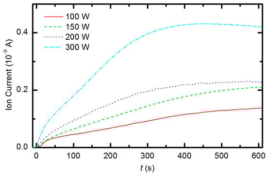 The etching of the polymer by plasma was also monitored by following the time evolution of the CO concentration. Figure 14 represents the partial pressure of the CO molecule versus treatment time at the power levels 100, 150, 200 and 300 W. The etching rate is higher if the sample is treated with plasma that is generated with a higher forward RF power. At 300 W, the concentration of CO reaches a maximum after a certain treatment time (approx. 350 s) and remains nearly constant with prolonged treatment. A feasible explanation for this observation is that all of the oxygen inside the discharge chamber has been consumed for polymer oxidation; therefore, CO can no longer be produced. After consuming the oxygen, the CO concentration slowly decreases as it is pumped out through the RGA chamber. This conclusion is supported by the time evolution of partial pressures at 300 W (Figure 15). One can observe practically no remaining oxygen after approximately 350 s of treatment. Approximately 5% of the initial partial pressure of oxygen can easily be explained by the dissociation of CO in the discharge and recombination of O-atoms into O2 on the surface of the discharge chamber.