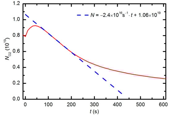 The behavior of the oxygen partial pressure in Figure 13 is rather unexpected and thus worth discussing. The oxygen partial pressure first increases with time, reaches a maximum after approximately 50 s of plasma treatment, and then decreases with further treatment. The increase in O2 partial pressure during the first 50 s is probably an artifact of thermal effects. The discharge power initially heats the gas inside the plasma chamber. The real power (35 W) dissipated in the plasma reactor causes slow heating of the gas until such a temperature is achieved that heating is balanced by cooling with ambient room-temperature gas. The pressure in the plasma chamber depends on the density of molecules and gas temperature: p = nkBT. The oxygen partial pressure in Figure 13 increased by approximately 10% from the initial value over a period of 50 s; therefore, one could estimate the gas temperature to be approximately 330 K at that treatment time. This gas temperature is an underestimate because oxygen is continuously being lost due to chemical reactions with the polymer sample (etching). A better estimate would account for this effect. The simplest method is to extrapolate the time derivative of the oxygen partial pressure towards zero, as shown in Figure 16. The difference in the measured oxygen partial pressure and the cross-section of the extrapolation line with the y-axis is approximately 30%; thus, a better estimate of the gas temperature after a 50 s treatment time is 390 K. This value is typical for cold, non-equilibrium gas plasma.