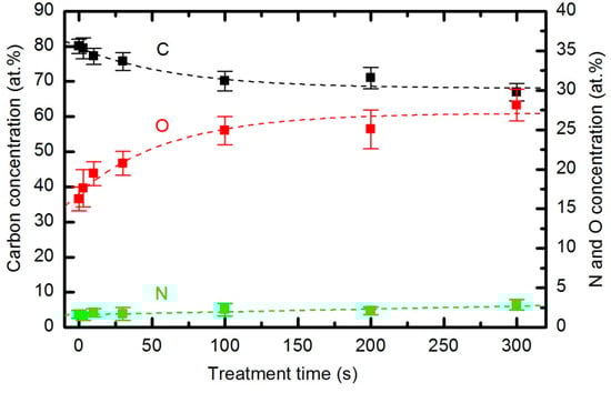Whatever the mechanism involved, the oxygen plasma treatment not only causes etching of the polymer but also results in functionalization [41,42] that modifies the wettability of the material. The functionalization in our case was investigated by XPS. Survey spectra were measured for each sample soon after plasma treatment to minimize the influence of any ageing effects (hydrophobic recovery). All characterized samples were treated at a pressure of 33 Pa and a forward power of 150 W. The composition of the surface film as calculated from the XPS survey spectra is shown in Figure 17. The results are not impressive. The original concentration of carbon is approximately 80 atomic %. It decreases monotonously, and the concentration after a prolonged treatment of 5 minutes is 65 atomic %. The opposite behavior is observed for oxygen and nitrogen. The nitrogen concentration is only up to 2 atomic %; therefore, considering the accuracy of this technique, the relative variations are not good representations of surface changes. Consequently, we limit our discussion to the evolution of the oxygen concentration. The oxygen concentration is approximately 17 atomic % for untreated samples, increasing to approximately 23 atomic % in the first 10 s of plasma treatment. The concentration continues increasing slowly until it reaches approximately 27 atomic % for the sample treated for 300 s. The survey spectra were measured at 3 spots on each sample, and the error bars in Figure 17 indicate the statistical error only. The results presented in Figure 17 therefore indicate that functionalization is not the predominant mechanism of interaction between reactive species from the oxygen plasma and the polymer surface. This type of polymer PURPEG does not exhibit much tendency to functionalize, which is explained by the instability of the oxidized surface material, which tends to desorb from the surface rather than accumulate much oxygen.