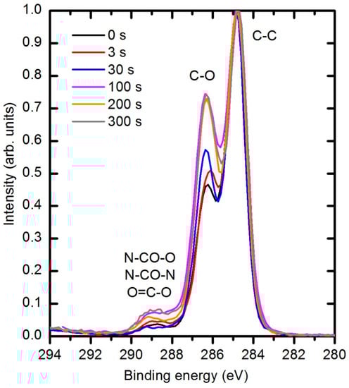 The types of newly formed functional groups can be deduced from XPS high resolution C1s peaks. Figure 18 represents the evolution of this peak for different plasma treatment times. Three sub-peaks are observed. The largest peak at 284.8 eV corresponds to bonds between carbon atoms, the second peak at 286.4 eV to the single bonds of either C–N or C–O, and the small peak at 289 eV to –NH–CO–O– and –NH–CO–NH– groups in the original polymer structure. Because the nitrogen concentration is small and does not change with plasma treatment, it is clear that the modifications in the C1s peak are due to interactions with oxygen. Both peaks at 286.4 and 289 eV increase with plasma treatment time. There is no reason for the increased concentration of the peak at 289 eV; therefore, one can conclude that the increased peak at this binding energy corresponds to the formation of a O=C–O carboxylic or ester group. Unfortunately, the technique does not allow us to distinguish between these groups because the difference in binding energy between them is too small [43,44,45]. The increasing intensity of the peak at 286.4 eV indicates that hydroxyl groups are also formed during plasma treatment.