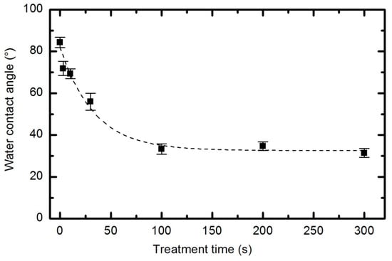 Water contact angle versus plasma treatment time at 33 Pa and 150 W.