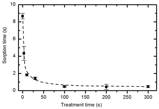 Improved sorption of water droplets does not require the saturation of the entire material with functional groups. Figure 20 reveals that the water droplet absorption time quickly drops from almost 9 s (for the untreated material) to 2 s (for samples exposed to plasma for 10 s). Further treatment does not have a significant influence on the adsorption time because even after 5 minutes of plasma treatment, the adsorption time remains at approximately 0.5 s.