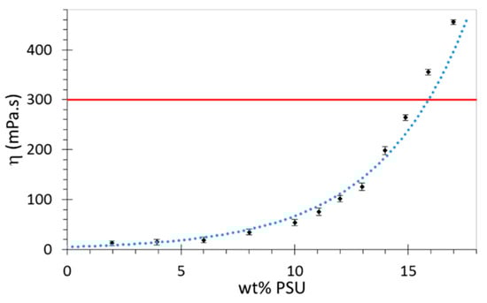 Viscosity curve of PSU solutions in N,N-Dimethylformamide (DMF) as a function of mass percent of PSU measured at 25 °C. The two-fluid nozzle theoretically only allows the spraying of solutions lower than 15 wt % (solid line).